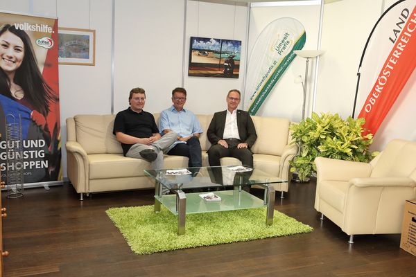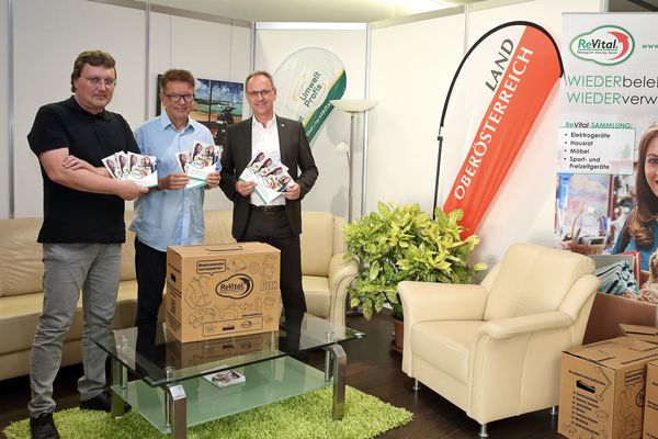 Im extra aufgebauten ReVital-Wohnzimmer im Ursulinenhof berichteten LAV-Vorsitzender Bgm. Roland Wohlmuth, Umwelt-Landesrat Rudi Anschober und Martin Zwicker von der Arbeitswelt Volkshilfe vom Erfolgskonzept.