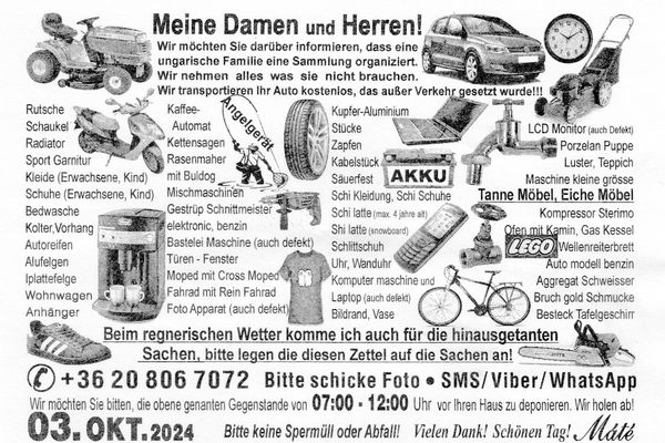 Vermehrt tauchen in den Postkasteln im Bezirk Braunau wieder Flugzettel auf, die die Abholung von Elektrogeräten, Schuhen, Altkleidern, Geschirr, Möbel,... direkt Zuhause in Aussicht stellen. Das ist illegal und mit hohen Strafen verbunden.