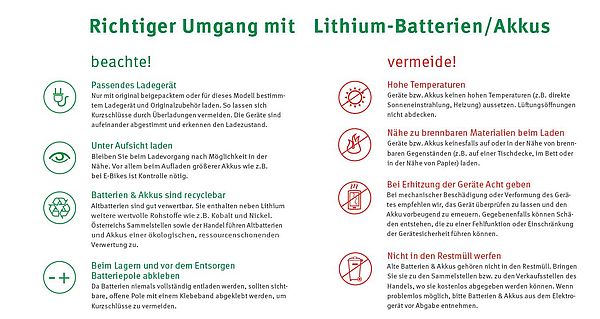 Mit den richtigen Hinweisen steht einem bedachten Umgang mit den Lithium-Akkus nichts mehr im Wege: So sollten Lithium-Akkus am besten nur mit passenden Ladegeräten geladen werden, das bedeutet, mit Originalzubehör oder für das Modell bestimmten Geräten. Idealerweise werden vor allem größere Akkus, wie jene von E-Bikes, unter Kontrolle aufgeladen.
