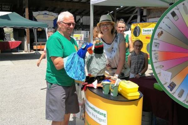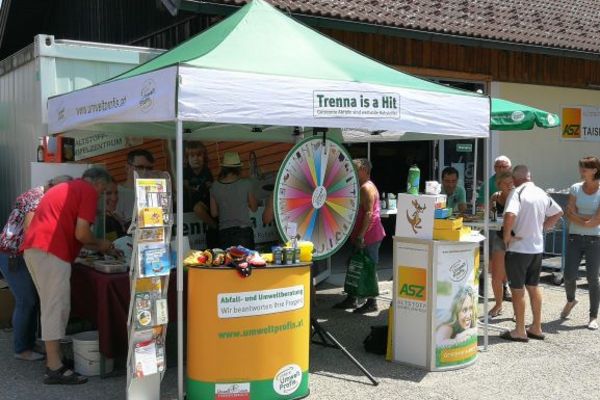 Trotz des heißen Badewetters nahmen sich die ASZ-Besucher gerne Zeit, um am Gewinnrad zu drehen und ihr Wissen zur richtigen Abfalltrennung zu beweisen. Auch das Abfallwurf-Tor fand großen Anklang bei Groß und Klein. Bürgermeister Karl Ehwallner, Vorsitzender des BAV Ried, begrüßte die zahlreichen Gäste, welchen von der FoodCoop GuaT - Gutes aus Taiskirchen regionale Köstlichkeiten vom Freilandschwein und Bio-Apfelsaft aufgetischt wurden.