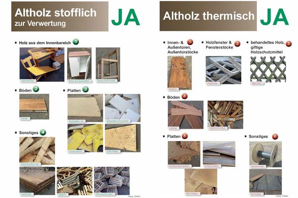 - Altholz thermisch: Türen; behandeltes Holz (z.B. Zäune); Laminat, Parkett verklebt; MFD-, Multiplex- und Holzfaserdämmplatten; Holz mit Dachpappe