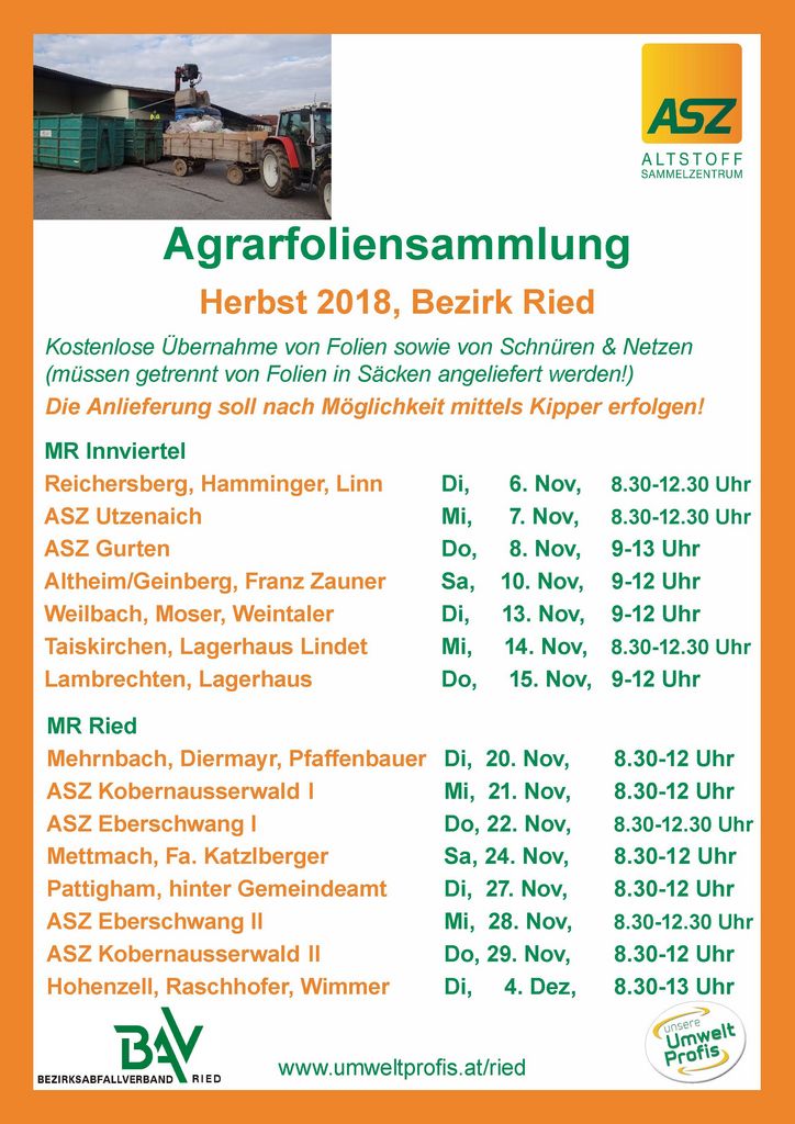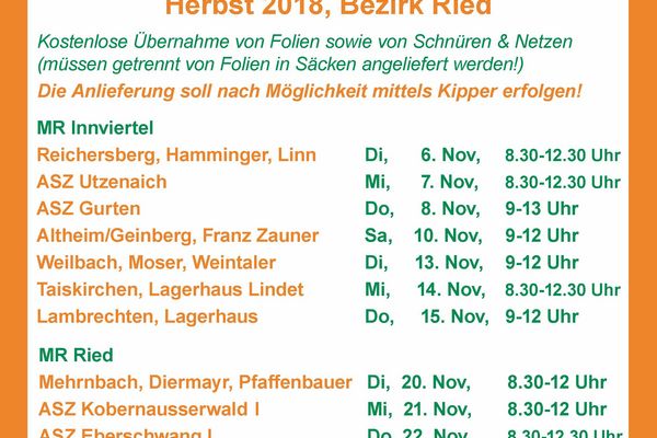 An 13 Standorten im Bezirk Ried wird im Zeitraum von 6. November bis 4. Dezember 2018 die BAV-Agrarfoliensammlung durchgeführt. Die Übernahme kann wieder kostenlos angeboten werden und trägt damit zu sauberer Umwelt und guter Luftqualität in unserer Region bei!