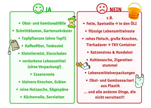 Bitte werfen Sie ausschließlich biogene Abfälle in Ihre Biotonne! Kunststoffe und alle anderen nicht verrottbaren Abfälle müssen mit großem Aufwand händisch aus dem Bioabfall aussortiert werden.