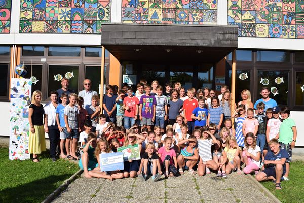 BAV-Vorsitzender Bgm. Mag. Herbert Brunsteiner und Bürgermeisterin Elisabeth Höllwarth-Kaiser mit Schüler*innen und Lehrer*innen der Volksschule Oberhofen a. I.