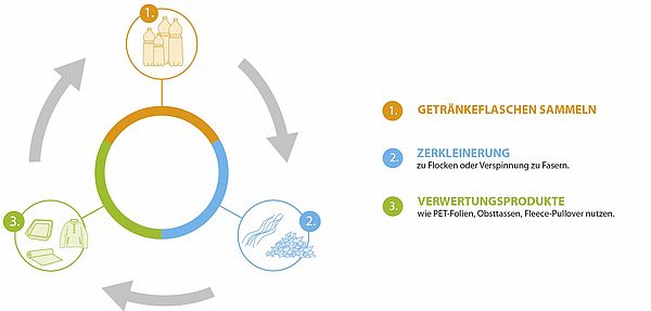 Drei von vier PET-Flaschen werden recycelt – das bedeutet, dass jährlich etwa 25.000 Tonnen PET-Flaschen recycelt und somit zu neuen Plastikflaschen oder anderen Produkten verarbeitet werden. Wer jedoch auf PET-Flaschen verzichtet und zu Leitungswasser statt zu Wasser aus der Plastikflasche greift, spart Geld, muss weniger tragen und vermeidet eine große Menge Verpackungsabfall. Das gilt zum Beispiel auch für Mehrwegtaschen.